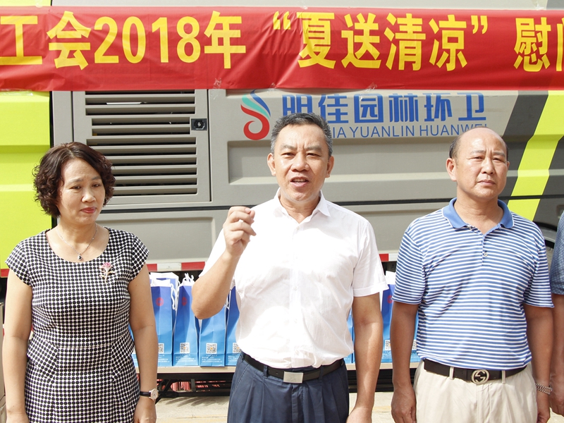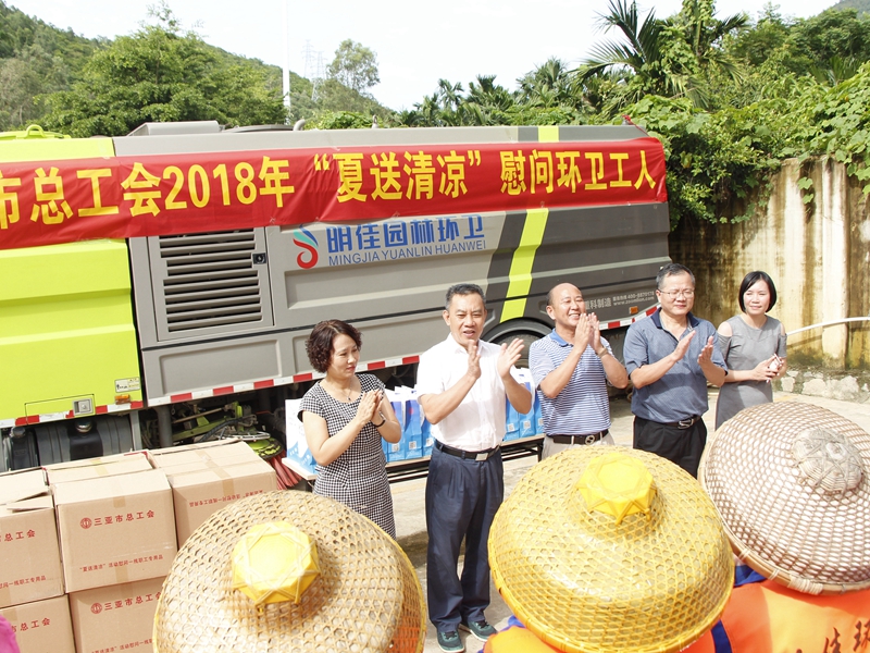 “你們辛苦了!感謝你們?yōu)槿齺喪忻瘛⒂慰蛣?chuàng)造了一個干凈整潔的人居環(huán)境,為三亞市“創(chuàng)文鞏衛(wèi)”工作作出的突出貢獻(xiàn)。”。張羽飛代表三亞市總工會向集團(tuán)公司全體職工致以親切的慰問。他指出,環(huán)衛(wèi)工人頭頂列日,揮灑汗水,以“寧愿一人臟,換來萬家凈”的精神,為靚扮鹿城、建設(shè)國際化熱帶濱海旅游精品城市提供衛(wèi)生保障。他勉勵大家繼續(xù)發(fā)揚三亞環(huán)衛(wèi)人的精神,勇當(dāng)尖兵的決心,提高環(huán)衛(wèi)作業(yè)質(zhì)量,在三亞市社會文明大行動和新一輪“創(chuàng)文鞏衛(wèi)”工作中作出新的更大貢獻(xiàn)。
