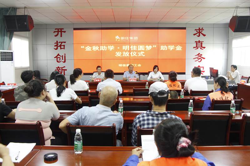 8月28日上午,明佳集團工會“金秋助學·明佳圓夢”助學金發(fā)放儀式在集團公司三樓會議室舉行,為8個考取大學的職工子女發(fā)放助學金共計9600元?偛藐愒、副總經理鐘寒參加發(fā)放儀式,儀式由工會主席高斐斐主持。