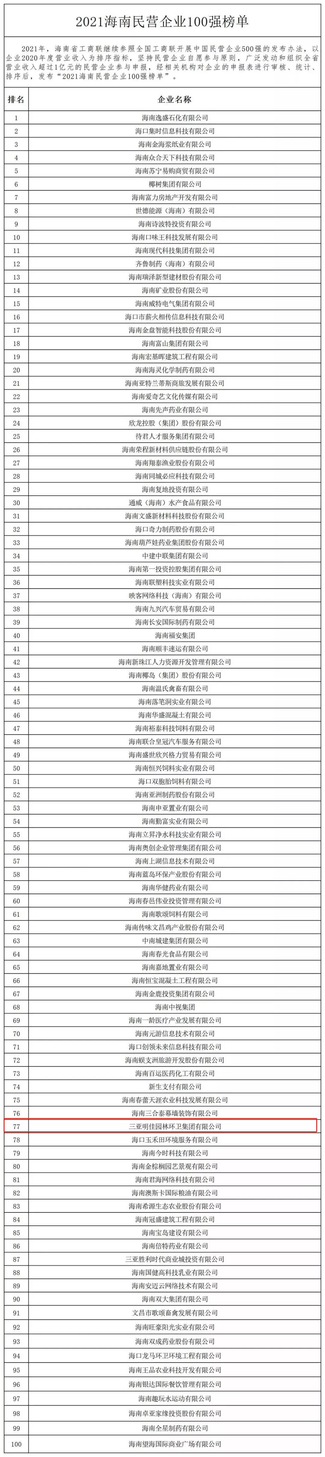 11月4日,海南省工商業(yè)聯(lián)合會在?诎l(fā)布“2021海南民營企業(yè)100強(qiáng)”榜單。三亞明佳園林環(huán)衛(wèi)集團(tuán)有限公司2019至2021年連續(xù)三年入選海南民營企業(yè)100強(qiáng)。